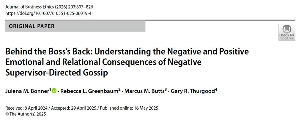 Bonner, J. M., Greenbaum, R. L., Butts, M. M., & Thurgood, G. R. (2026). Behind the boss’s back: Understanding the negative and positive emotional and relational consequences of negative supervisor-directed gossip. Journal of Business Ethics, 203, 807–826. https://doi.org/10.1007/s10551-025-06019-4